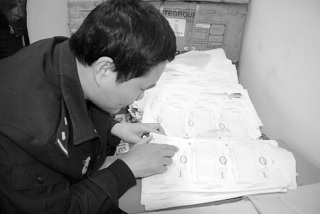 图为民警在清点查获的部分假发票。(沈孙晖 朱和风 摄)